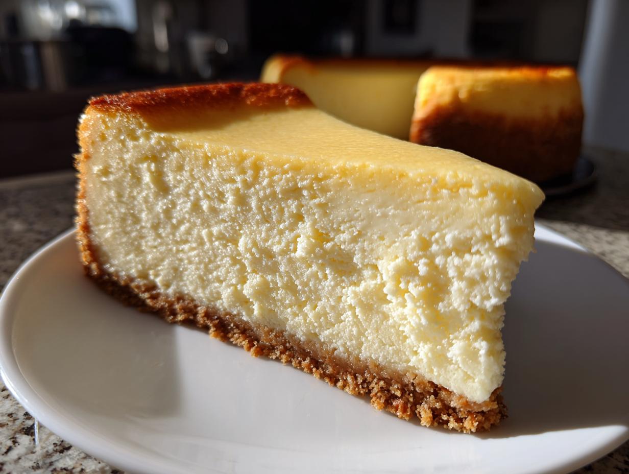 A perfect slice of classic cheesecake with a graham cracker crust, showcasing its creamy texture and golden-brown top.