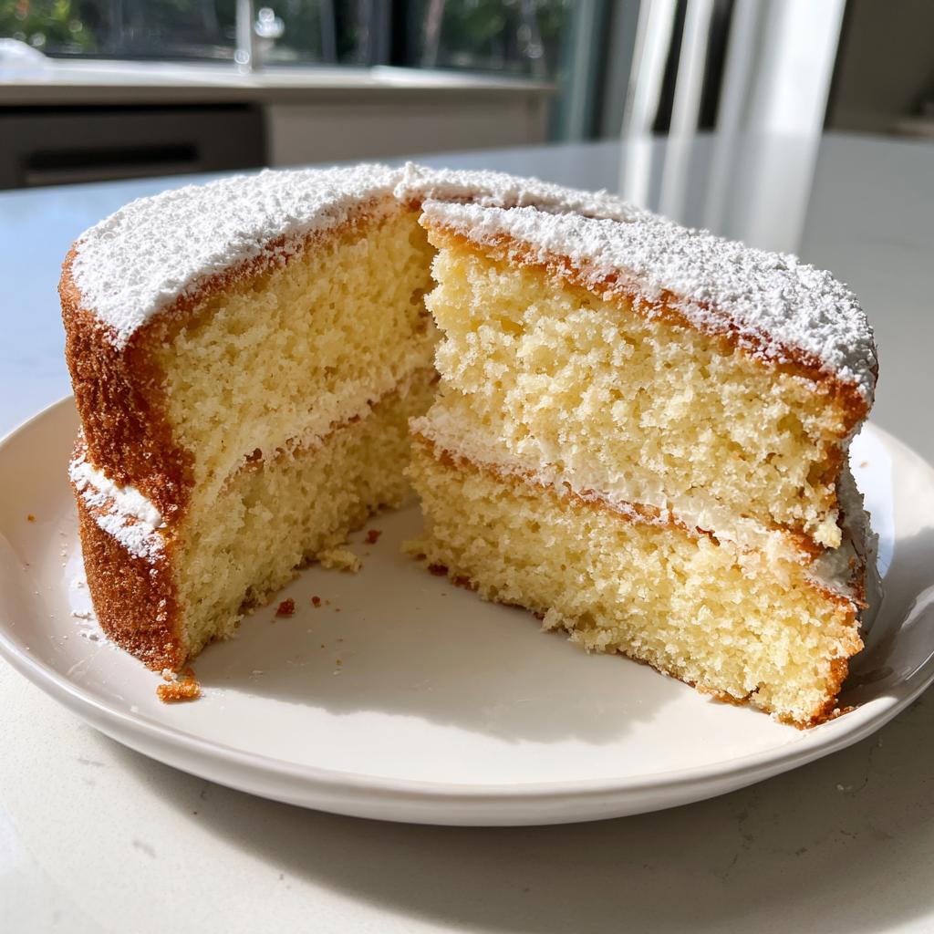 A slice of a fluffy vanilla cake with powdered sugar, showcasing its layers and soft crumb.