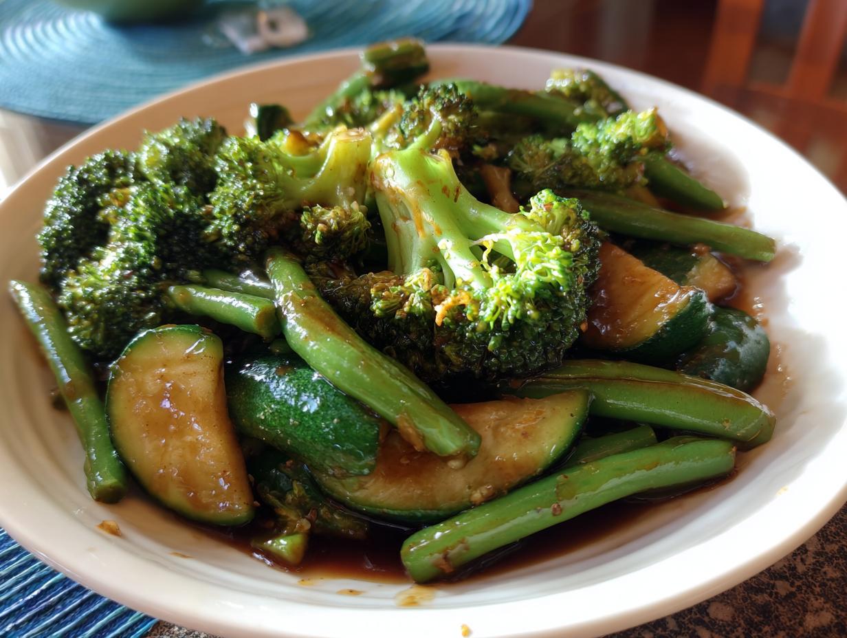 - Add broccoli, green beans, and zucchini. Stir-fry for 5-7 minutes until vegetables are tender-crisp.