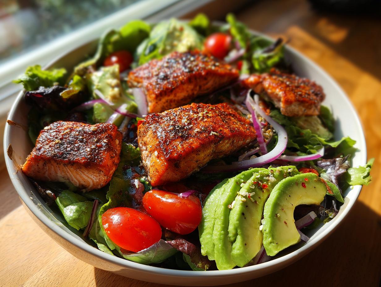 - Top the salad with the grilled salmon fillets and serve immediately.
