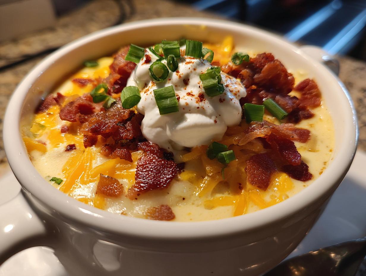 There’s nothing quite like a steaming bowl of loaded baked potato soup with bacon to warm you up on a chilly evening. I still remember the first time I made this for my family – my husband took one bite, closed his eyes, and declared it “better than his favorite steakhouse version.” And honestly? I agreed! This soup has everything you love about a loaded baked potato – creamy russets, crispy bacon bits, sharp cheddar, and that dollop of cool sour cream – all in spoonable form. It’s become our go-to comfort food when the weather turns cold, or frankly, whenever we need a little edible hug. The secret is in the texture – blending just half the potatoes gives you that perfect balance between velvety smoothness and satisfying chunks. Trust me, once you try this potato-packed wonder, you’ll understand why my kids start begging for it as soon as the leaves begin to change color.