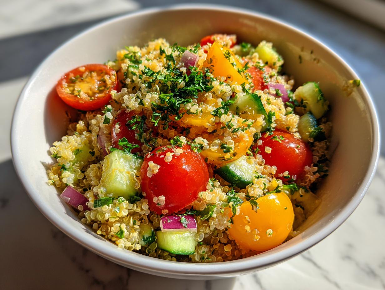 - In a large mixing bowl, combine cooled quinoa, cherry tomatoes, cucumber, red onion, and parsley.