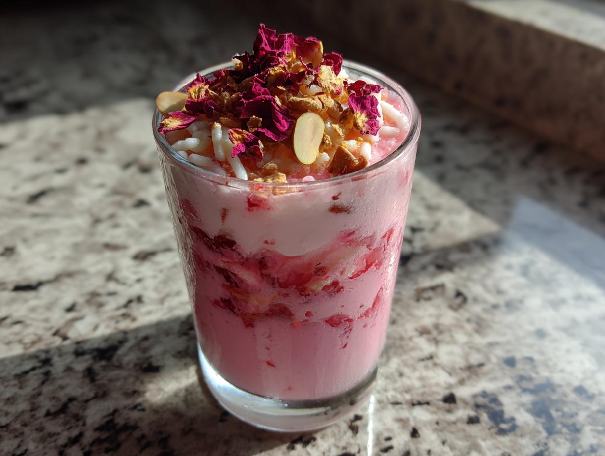 Here comes the grand finale! Slowly pour your rosy milk mixture over the falooda components – watch how it cascades through the layers like a pink waterfall. Top with a generous sprinkle of chopped nuts (I’m heavy-handed with pistachios) and those delicate rose petals if you’re feeling fancy. Serve immediately with long spoons for maximum layer enjoyment. The first sip after a long fast? Pure bliss!
