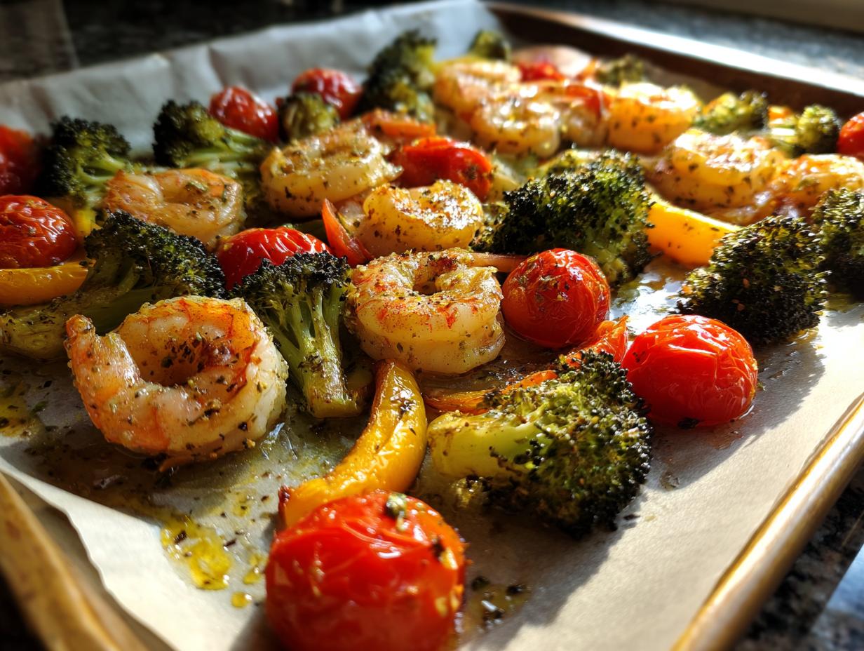 A simple and healthy meal with shrimp and vegetables roasted on a sheet pan.