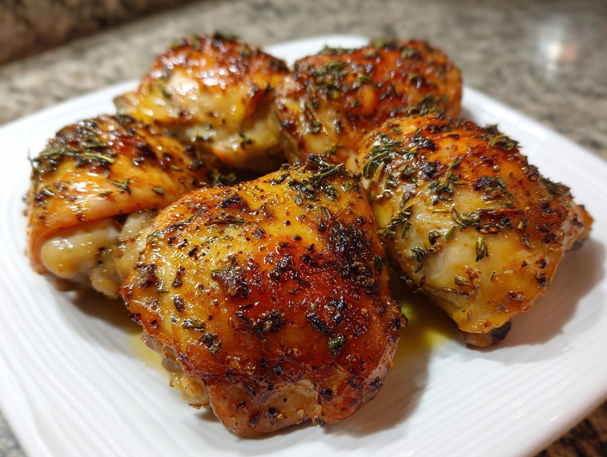 - In a bowl, mix the chicken thighs with olive oil, salt, black pepper, garlic powder, and paprika until evenly coated.