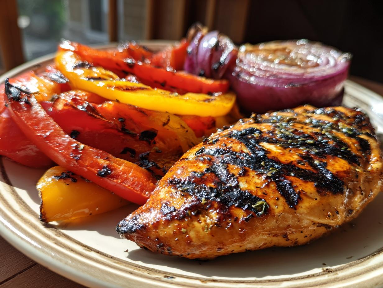 Now for the fun part! Fire up your grill to medium-high heat (about 375°F to 400°F—you want those pretty grill marks without burning everything). Take the chicken out of the marinade (shake off the excess so it doesn’t flare up) and lay it on the hot grates. Resist the urge to poke and prod! Let it cook for 6-7 minutes per side until it’s golden and the internal temp hits 165°F. Toss the peppers and onions on during the last few minutes—they just need a quick char, about 3-4 minutes, turning once. Pro tip: If you’re feeling fancy, brush a little extra marinade on the veggies as they cook. Serve it all up with a big smile and maybe a cold drink—you’ve just nailed the perfect spring backyard BBQ!