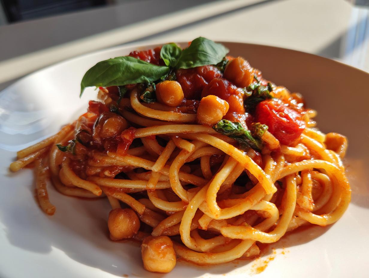 Close-up of tomato chickpea pasta with basil in a white bowl under natural light