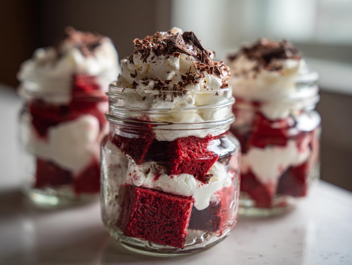 Here’s the best news about these Valentine’s red velvet trifles—they actually get better when made ahead! I always assemble mine the night before so the flavors can really mingle. Just pop those pretty jars in the fridge (with lids on to keep them fresh) for up to 24 hours before serving. The cake absorbs a bit of the creaminess, making every bite even more dreamy.